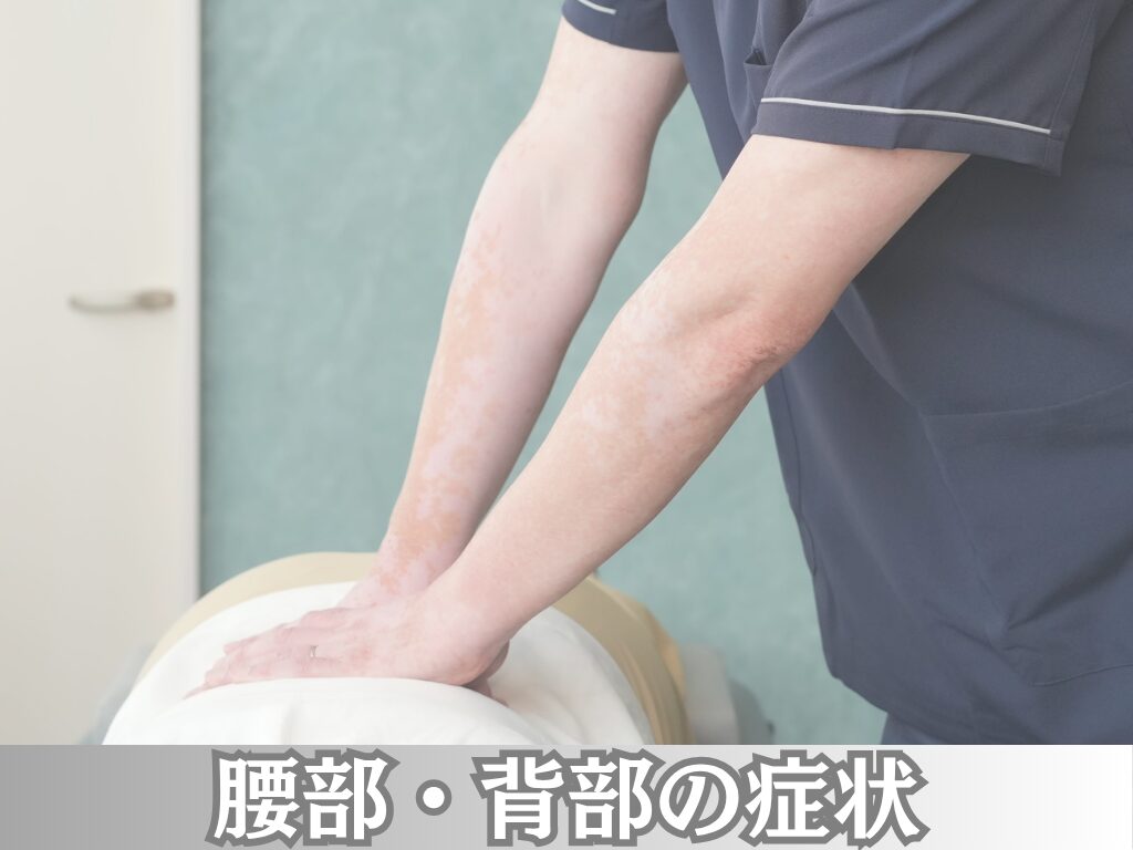 - 慢性腰痛、ぎっくり腰、腰椎ヘルニア、脊柱管狭窄症、坐骨神経痛